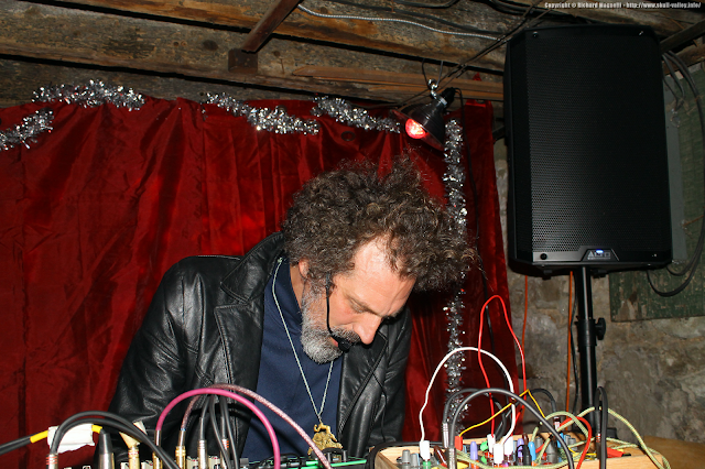 Finally, Bill Nace and Twig Harper were ready to play. It was nice to have the show moving and finishing before it was a-million-o'clock. For their performance, it seemed like Nace produced various sounds, starting with small pieces of percussion and moving to prepared guitar, while Harper modified the sounds and played them back. Twig Harper also did some vocals, scary breathing and gasps. The piece started slowly, creeping up on the audience as it went along into harsher realms of terror that I envision as a green color, the inside of some hideous worm. The vocals started to become inhuman as well. The rushing noise and space sounds of modulated delay gave way to a calmer rustling peace that faded out to the claps of the crowd in the small room. Then I proceeded to go up to Bill Nace and say I saw him with Sonic Youth in Washington D.C. instead of No Fun Fest as I mentioned above. He was really confused until I realized my mistake. You can't win them all.